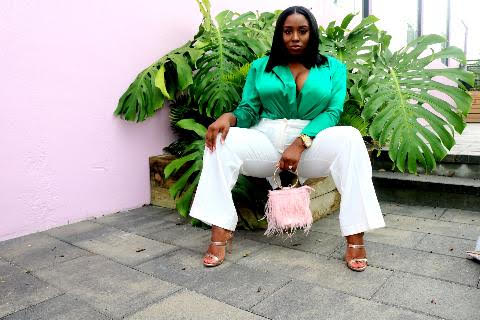 It's summer time! The perfect time for color combination. Be BOLD no boring lol. At this moment I'm obsessed with the color green. I found this blouse while thrifting for only $3.00. Every woman needs a pair of white slacks. They are perfect for any occasion. I also found my slacks in the thrift store for only $3.00. My shoes are literally the most comfortable shoes in my closet from Steve Madden. My pretty & pink clutch is from Galleria Couture.